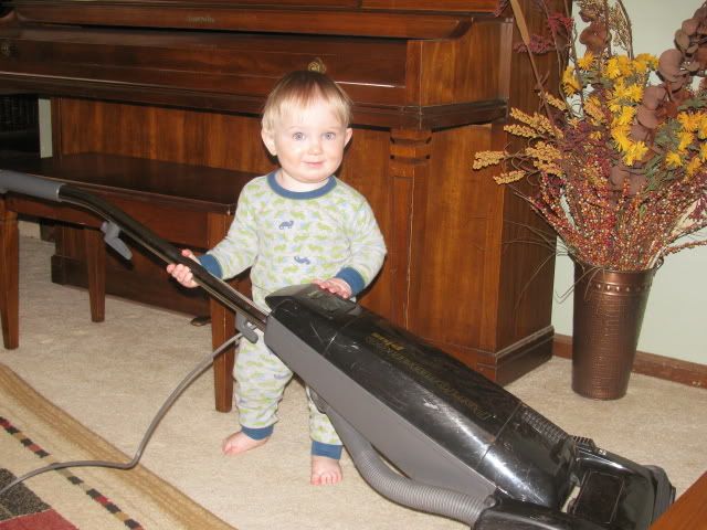Luckily, Dave found 2 of those push vacuum's (I don't know what they're really called...but the thing that Taylor is using). Dave's grandma used to sell Fuller Brush (cleaning supplies) and we gained these when we moved into her old house when we got married. If you add our swiffer vac, and the real vacuum....we have enough things for everyone to push.