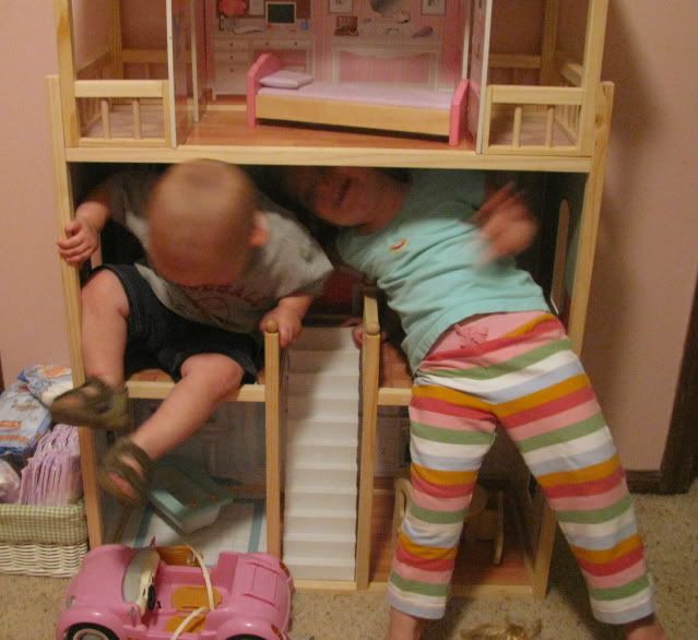 Oh, and if you're wondering (like I was) how in the world he got in there like that....notice the Barbie car on the floor. He rolled that over and used it as a step to get up in the house.